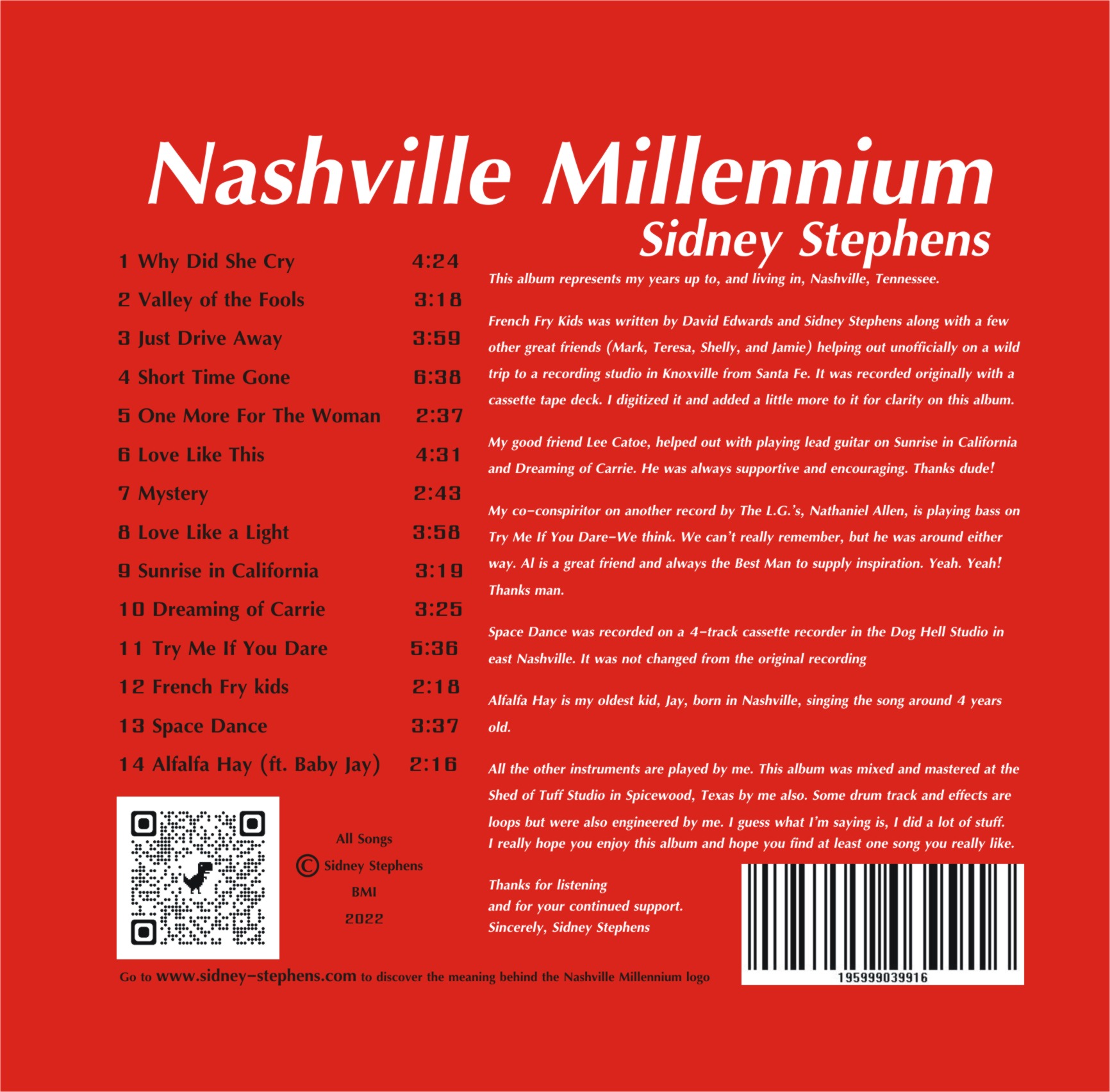 Nashville Millennium is the second album in a series of the music written in my earlier days. The cover design that resembles a paper airplane, is actually a line connecting the dots on a map from all the towns in which I played and developed my music. Roswell and Santa Fe, New Mexico, Lubbock and Austin, Texas, and Nashville, Tennessee. I didn’t include Tempe, Arizona since I never performed there, but I did buy my twelve string on Mill Avenue and learn to play it in the wee hours inside the acoustic tile walls of the apartment complex laundry room. I chose the twelve string for it’s difficulty.